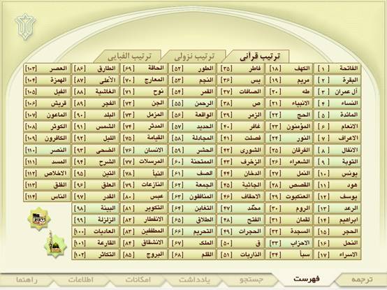ü فهرست نام سورهها به سه ترتيب (قرآني, نزولي, الفبايي).